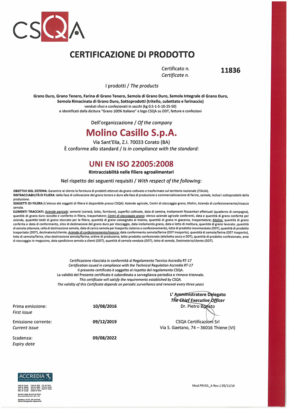Tutte le filiere di Prime Terre sono controllate e certificate da CSQAente di certificazione che opera a livello internazionale nei settori agroalimentare, pubblica amministrazione, servizi pubblici e socio-sanitari, turismo, servizi.